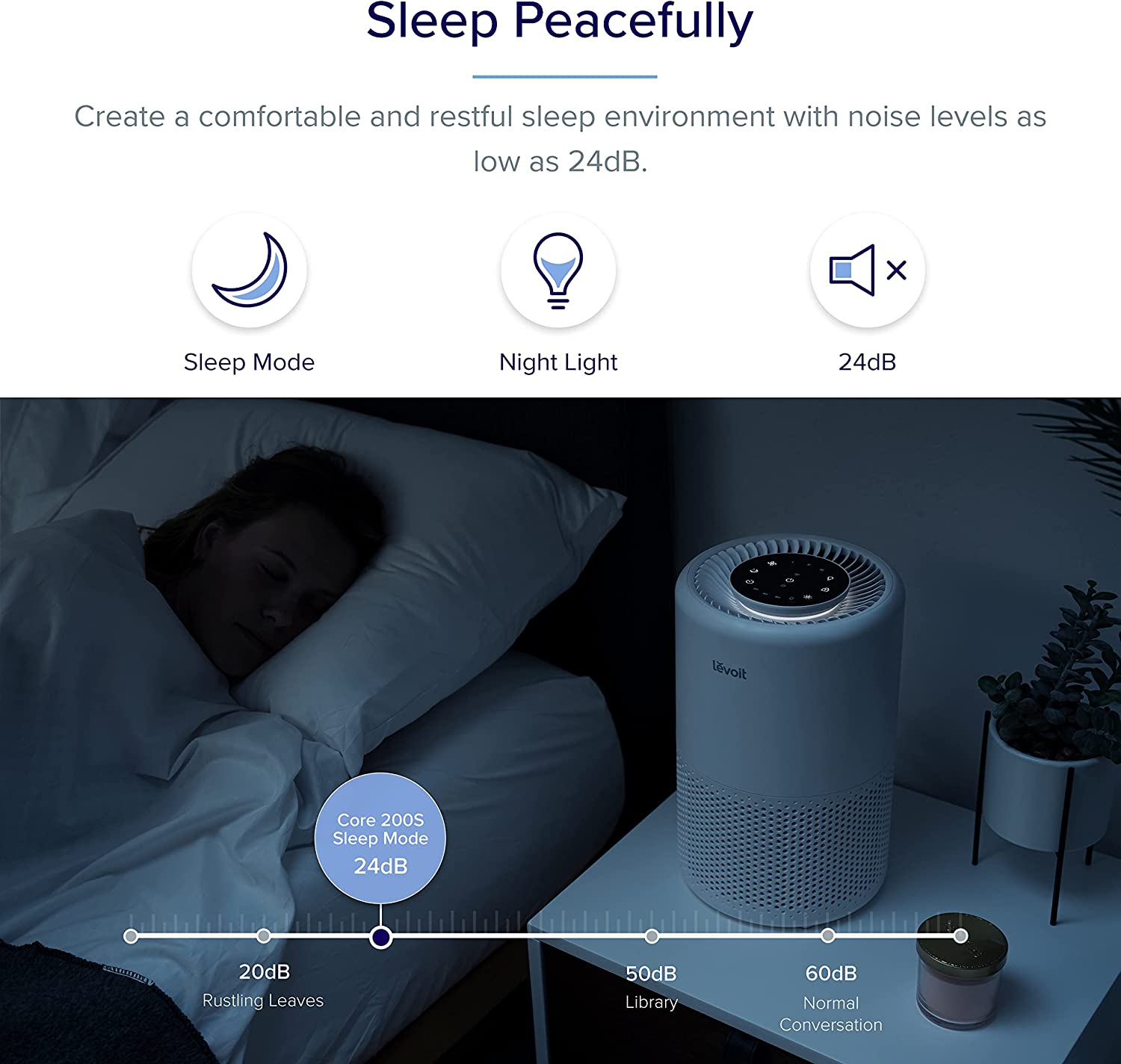 • QUIET OPERATION: With noise levels as low as 24dB, the Core 200S cleans your air without keeping you up at night. For a completely uninterrupted sleep, turn off all lights with the Display Off button
