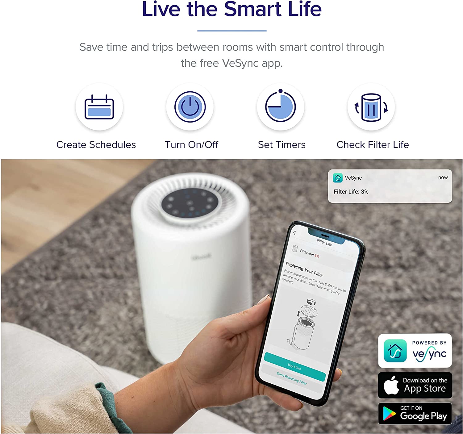 • ACCESS ANYWHERE: With the VeSync app, you can control your smart air purifier from anywhere. Adjust settings while you’re in the other room, at the office, or out walking the dog