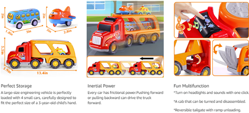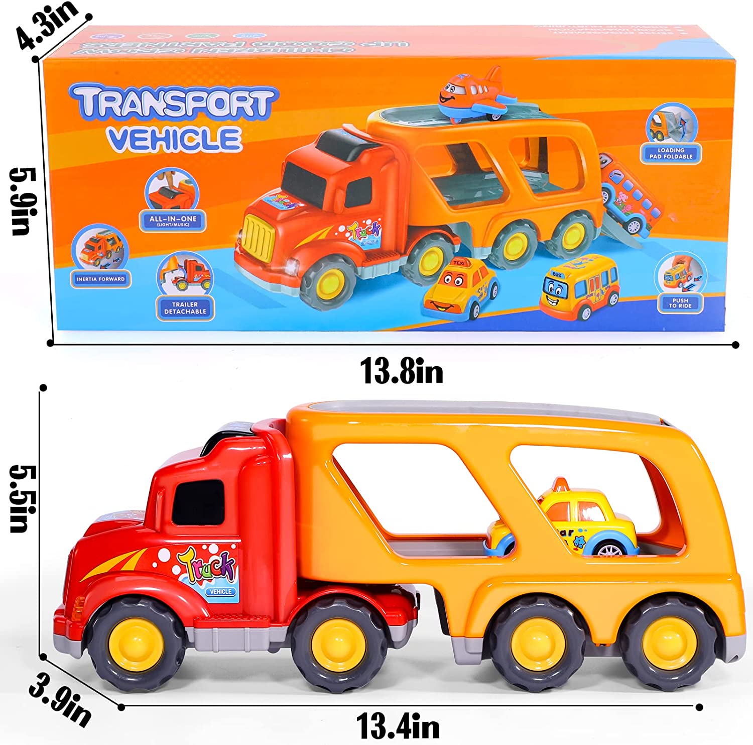 If your little boy wants to own 5 car toys at once, this is definitely a no-regret choice! Big truck with lights and music, can carry 4 cute cartoon construction trucks with built-in inertia and no need for batteries, the first choice for birthday/party/Christmas gift for a 2 3 4 5-year-old boy.