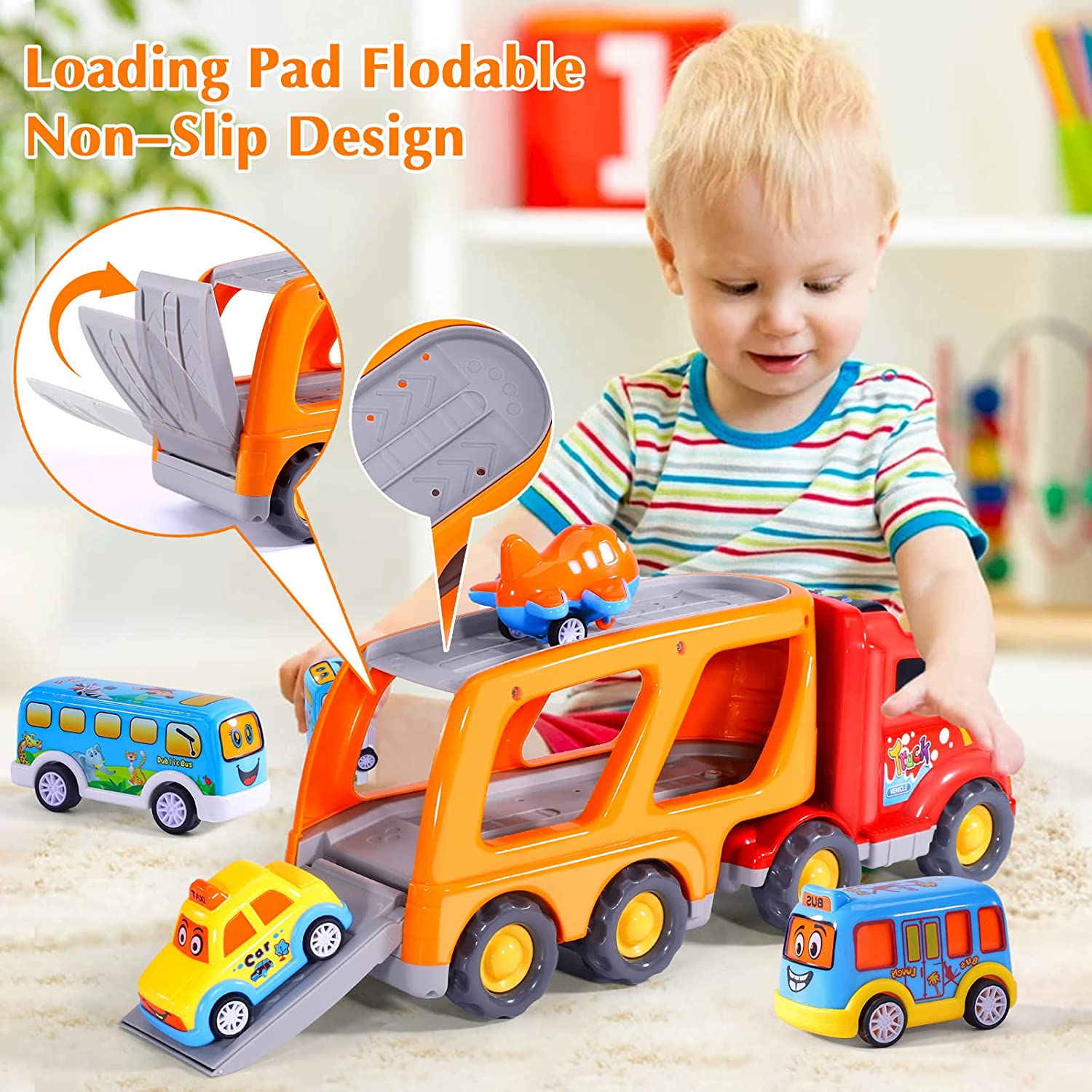 Bennol Carrier Toddler Trucks Vehicles Toys - 5 in 1 Car Toys for 1 2 3 4 5 Year Old Boys Toddlers, Cute Cartoon Kids Toy Cars Friction Power Set, Push and Go Play Cars and Trucks (RED)