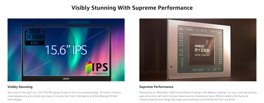 Acer Aspire 5 A515-45-R74Z comes with these high level specs: AMD Ryzen 5 5500U Hexa-Core Mobile Processor 2.1GHz with Precision Boost up to 4.0GHz (Up to 8MB L3 Cache), 15.6" Full HD (1920 x 1080) widescreen LED-backlit IPS Display, AMD Radeon Graphics, 8GB DDR4 On-Board Memory, 256GB NVMe SSD, 1 - Available Hard Drive Bay, True Harmony Technology, Two Built-in Stereo Speakers, Acer Purified.Voice Technology with Two Built-in Microphones, Intel Wireless Wi-Fi 6 AX200 802.11ax Dual-Band 2.4GHz and 5GHz featuring 2x2 MU-MIMO technology, 10/100/1000 Gigabit Ethernet LAN (RJ-45 port), Bluetooth 5.0, HD Webcam (1280 x 720), 1 - USB 3.2 (Type-C) Gen 1 port (up to 5 Gbps), 2 - USB 3.2 Gen 1 Ports (one with Power-off Charging), 1 - USB 2.0 Port, 1 - HDMI 2.0 Port with HDCP support, Backlit Keyboard, Lithium-Ion Battery, Up to 11-hours Battery Life, Windows 11 Home, 3.88 lbs. | 1.76 kg (system unit only) (NX.A84AA.005).