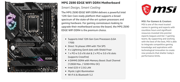 MSI MPG Z690 Edge WiFi DDR4 Gaming Motherboard (ATX, 12th Gen Intel Core, LGA 1700 Socket, DDR4, PCIe 4, CFX, M.2 Slots, Wi-Fi 6)