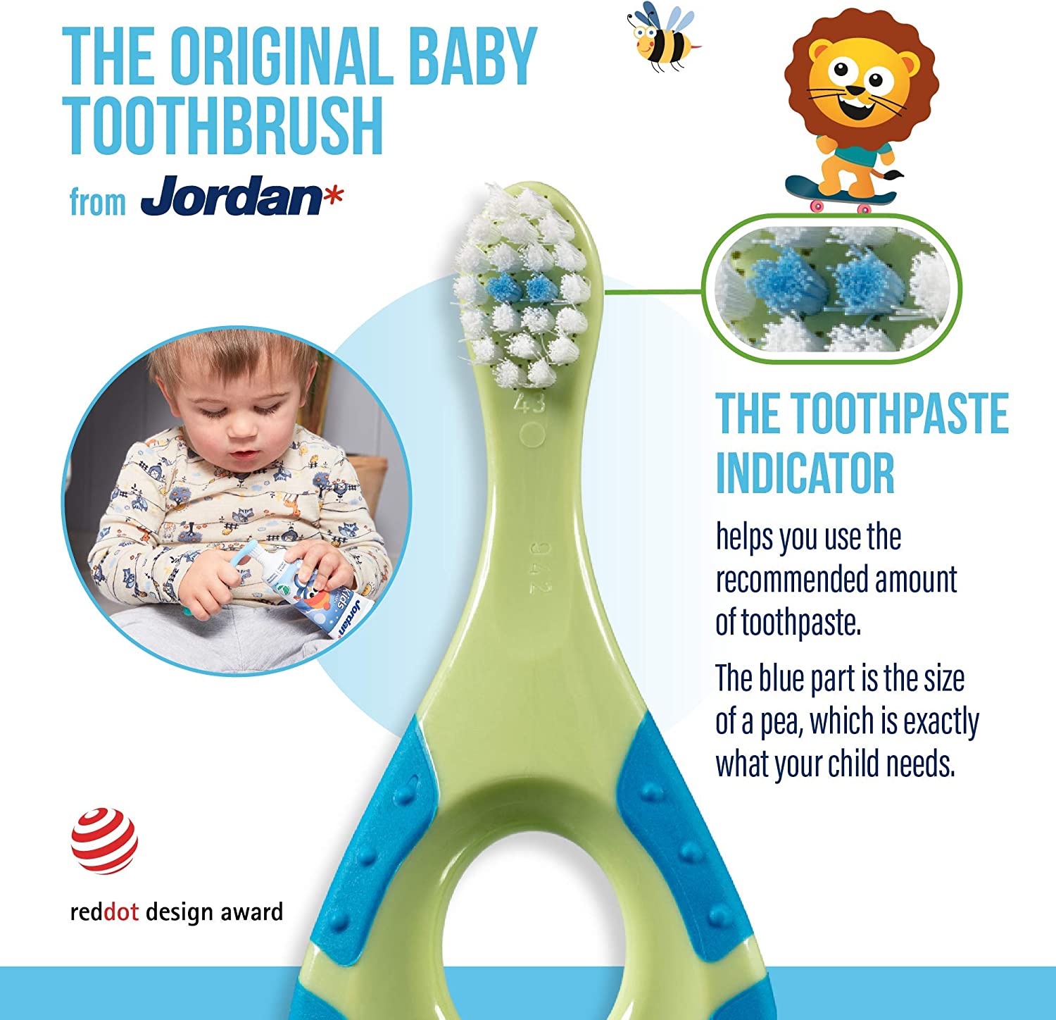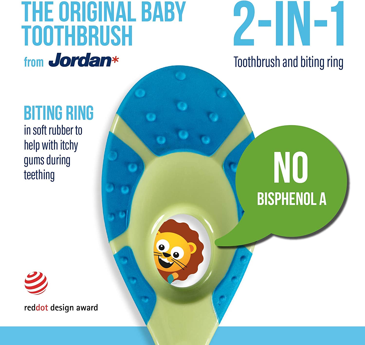 - MADE FOR YOUR BABY - Jordan* is the original brand of this infant toothbrush designed with extra soft bristles, a soft biting ring for babies gums, and a handle that suits adults and babies