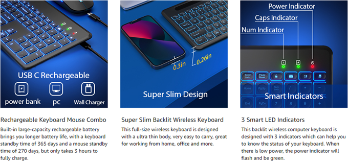 A1:The wireless keyboard has 7 switchable backlit modes and the cordless mouse has 7 random colors for the backlights.