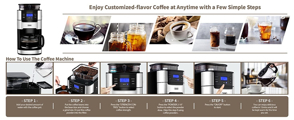 - ☕【1.5L LARGE CAPACITY】: The Grind Coffee Machine can brew up to 10 cups coffee. Set the number of coffee powder (2,4,6,8,10) through pressing "CUP 2-10" button base on your own needs. If not, the default number of cup is 10.【NOTE: when making coffee, the amount of coffee powder added should correspond to the amount of water, if the machine finishes without running out of corresponding amount of water, you can start it again.