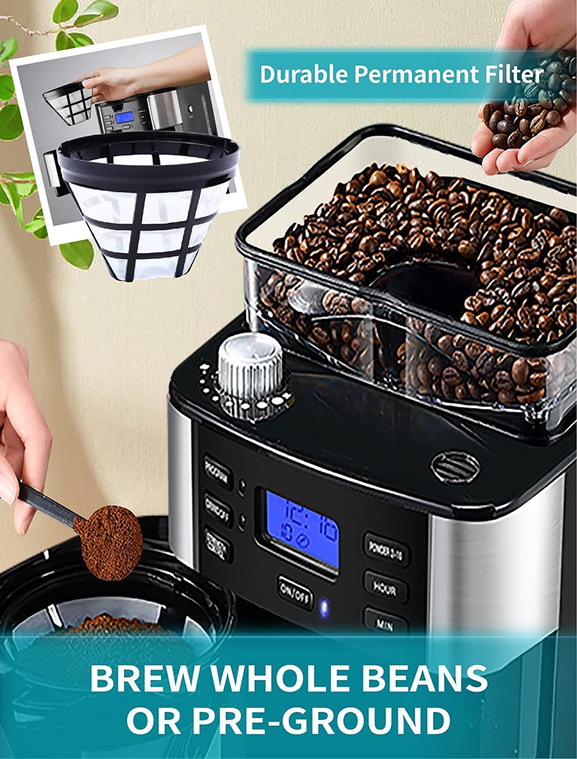 - ☕【EASY TO OPERATE】: Depending on your personal preference, choose coffee beans or coffee powder to make drip coffee. The coffee machine is equipped with a burr grinder, so you can brew a cup of fresh coffee with coffee beans. The coffee beans are gathered and ground by the burr grinder, retain the full flavor of the beans, then the coffee powder will fall directly on the filter.