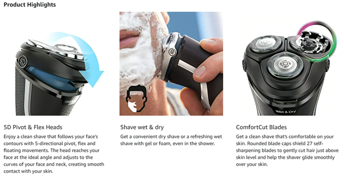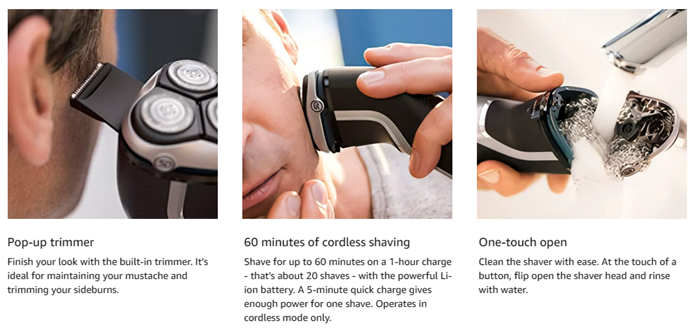 - Enjoy a clean shave that follows your face's contours with 5-directional pivot, flex and floating movements. The head reaches your face at the ideal angle and adjusts to the curves of your face and neck, creating smooth contact with your skin.