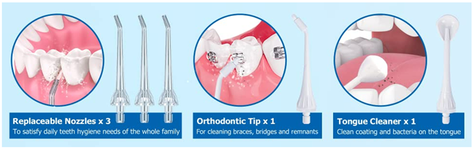- PORTABLE DESIGN FOR TRAVEL: This water teeth cleaner picks with 5 replacement jet tips for multiple family members that can rotate 360 degrees during use, to fulfilled your variety needs from standard clean to gum massage, suitable home, office, business trips or traveling use on the go