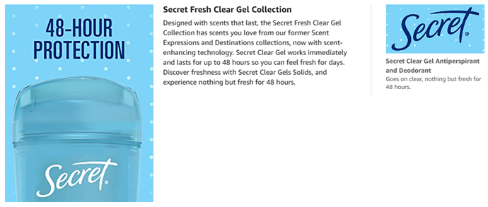 Designed with scents that last, the Secret Fresh Collection has scents you love. Secret Antipirspirant and Deodorant for Women Fresh Clear Gel immediately fights odor and provides 48-hour sweat and odor protection, helping you stay fresh and confident day in and day out. Secret’s unique clear gel formula goes on clear, dries fast, and provides a burst of freshness that lasts all day long. Secret Fresh Clear Gel with pH Balancing Minerals is nothing but fresh for 48 hours.