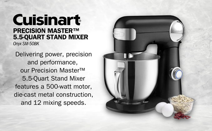 Delivering power, precision and performance, our newest stand mixer features a 500-watt motor, die-cast metal construction, and 12-speeds that allow for nuance and excellence in performing a variety of preparation tasks. The unit's tilt-back head allows for easy access to its 5.5-quart mixing bowl, while the included splash guard prevents messy countertops. Also included are a chef's whisk, dough hook, and flat mixing paddle. The mixing bowl and all accessories are dishwasher safe, and the stand mixer is available in ruby red, white linen, onyx, periwinkle blue, robin's egg, and silver lining. Additionally, you can purchase a variety of attachments for the unit: a pasta roller and cutter, pasta extruder, meat grinder, frozen dessert maker, and spiralizer.