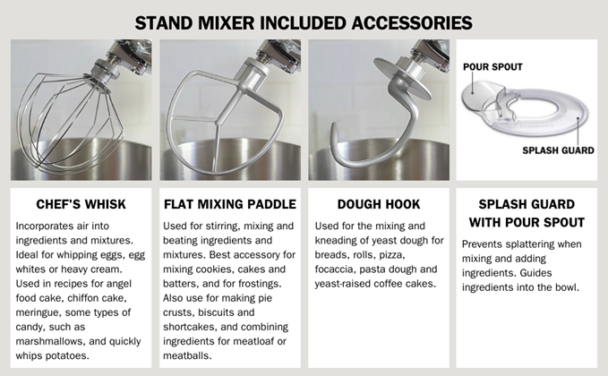 - INCLUDED: Chef’s whisk, dough hook, flat mixing paddle, and splash guard with pour spout – also included is an instruction manual and recipe book