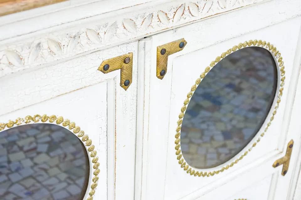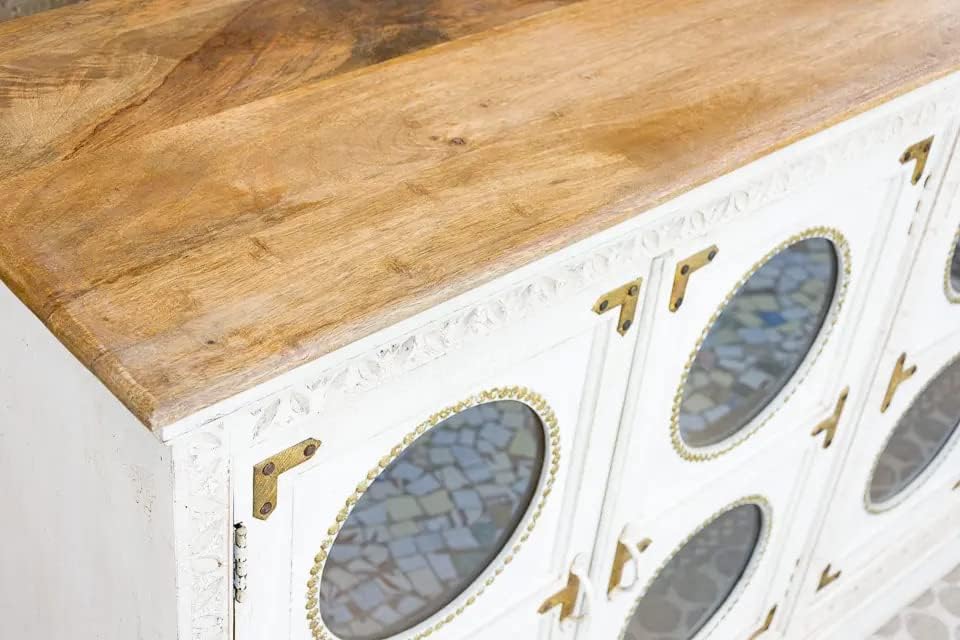 Antique Indian Brass Work Hand Carved Solid Wooden Sideboard Whitewash Mango Wood Indian Arched Sideboard Cabinet Storage Units Indian Solid Wood Finish,Living Room Bedroom Furniture,Modern Sideboard