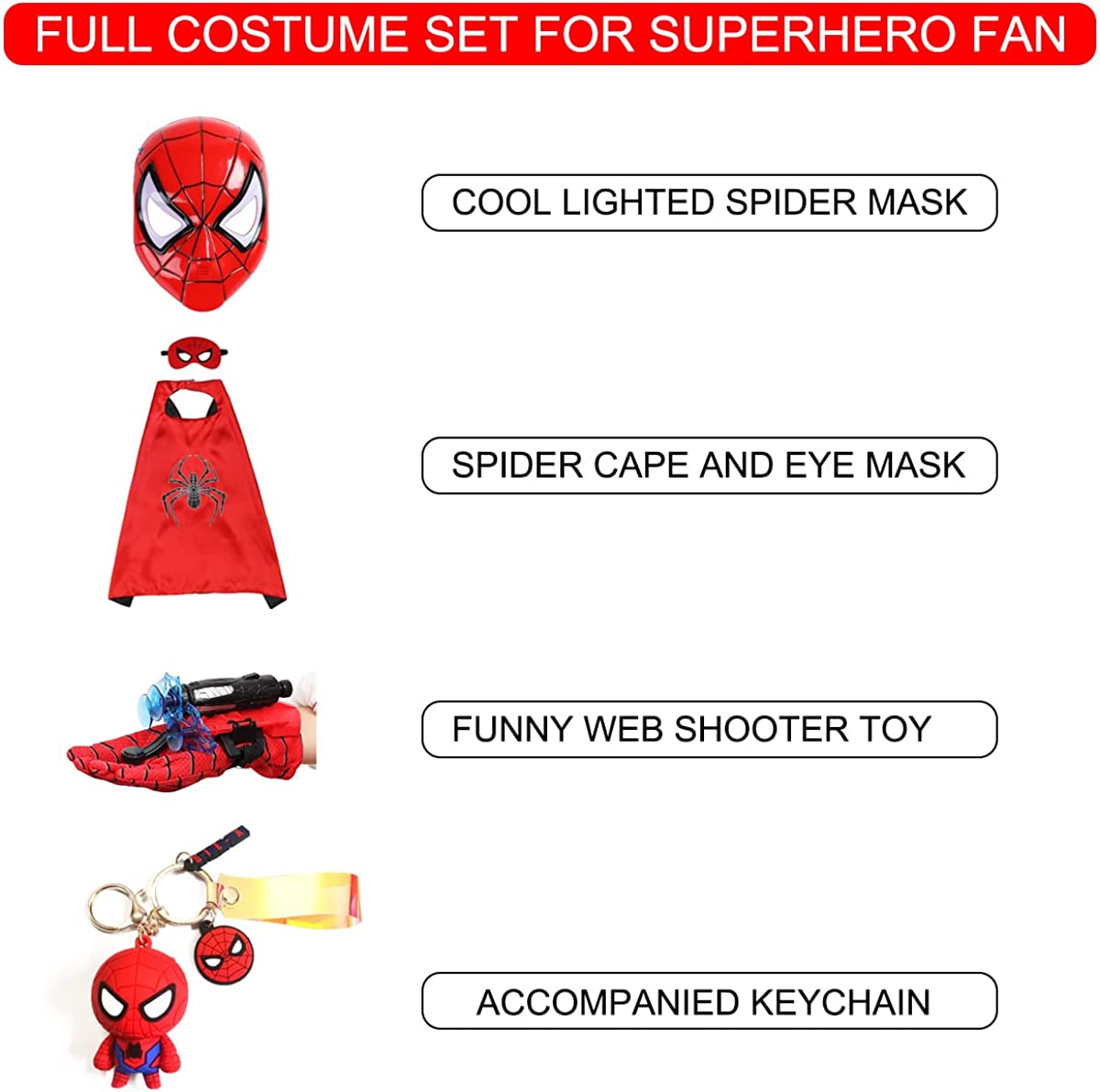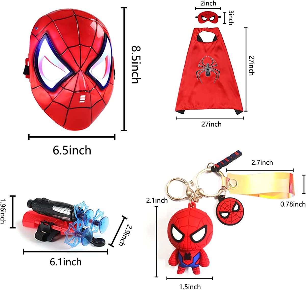• DREAMING SUPERHERO PLAYSET FOR KIDS: 1PC Web Shooter with 3 toy launchers,1PC Led Mask,1PC Superhero Cape,1PC Felt Eye Mask,1PC Spider Toy Keychain for Backpack